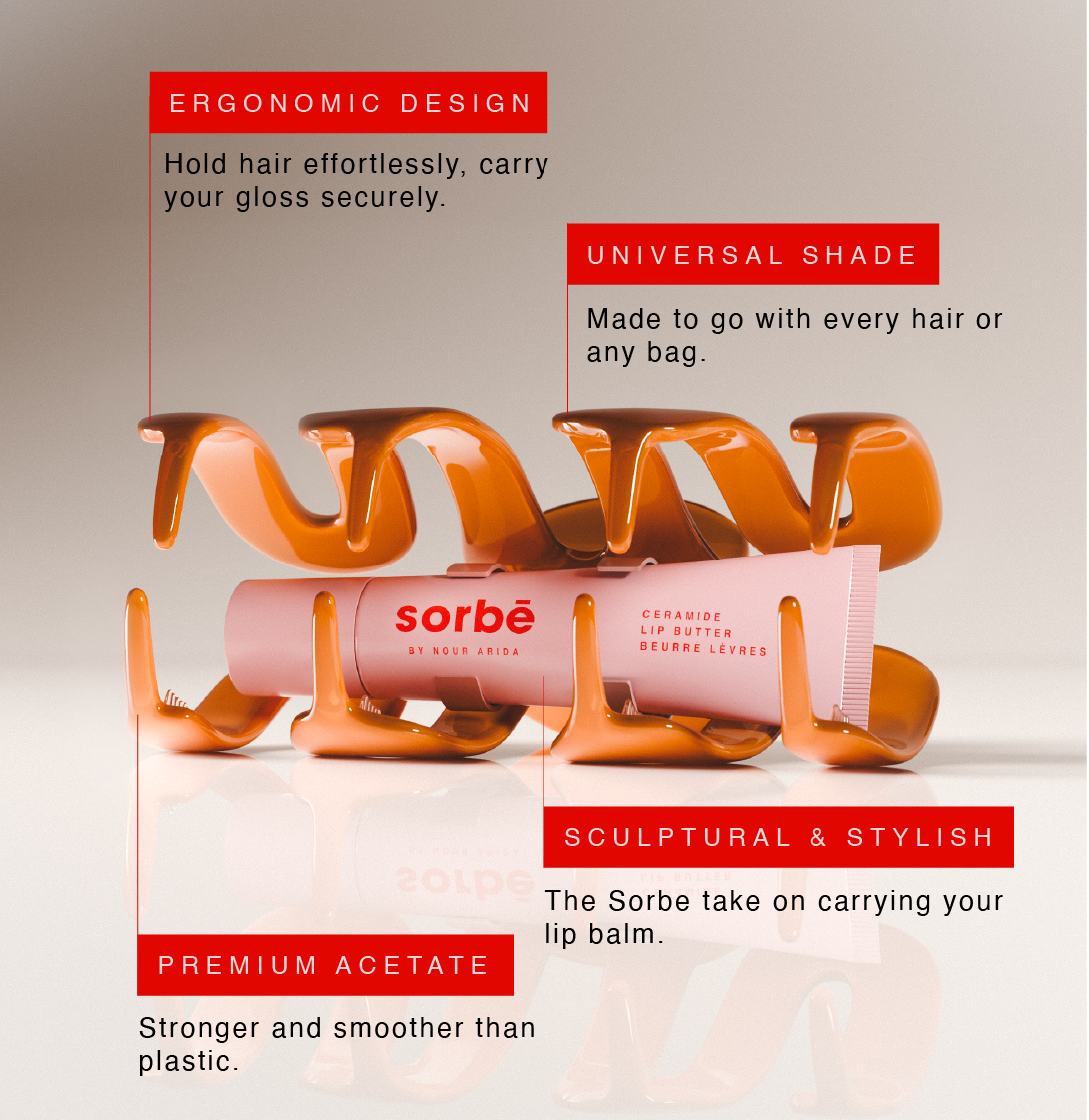 An under-patent innovation by Sorbé, this premium hair clip in cellulose acetate does it all.